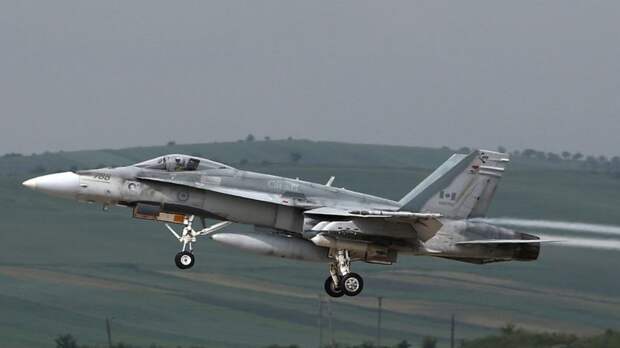 Канадский истребитель F-18 взлетает с авиабазы Кымпия-Турзи во время учений в 2014 году. Теперь на базе размещены на временной основе американские истребители F-15 и штурмовики А-10
