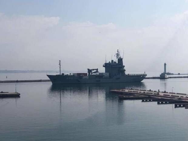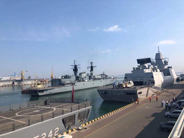 «В Одесский порт прибыли 3 фрегата Второй постоянной военно-морской группы НАТО – Standing NATO Maritime Group Two (SNMG2) – 1) флагман, ракетный фрегат королевских ВМС Нидерландов HNLMS De Ruyter (F804), 2) фрегат ВМС Турции TCG Fatih (F242), 3) фрегат ВМС Румынии ROS Regele Ferdinand (F221).