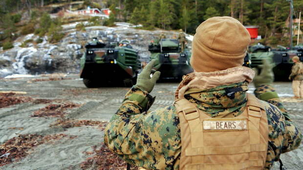 Подпись к изображению: Гусеничные десантные машины-амфибии Корпуса морской пехоты США во время построения на площадке фьорда Трондхейм, Норвегия, 9 января 2016 года