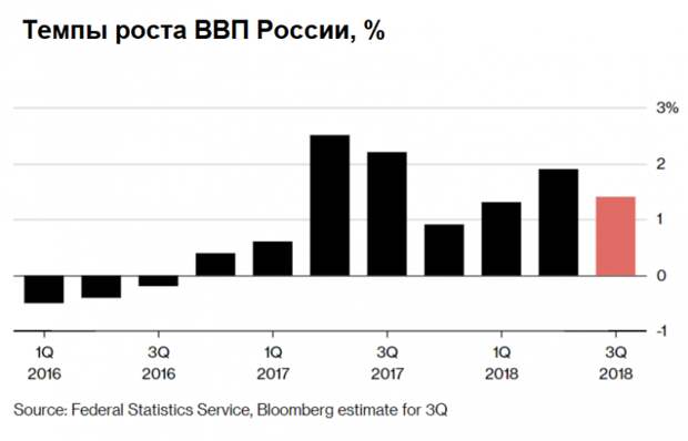 Согласно опросу Bloomberg, в третьем квартале экономика выросла на 1,4%, в предыдущие три месяца она росла на 1,9%. После своего переизбрания в марте Путин пообещал ускорить рост до уровня, который превысит средний мировой показатель в 3,7%.