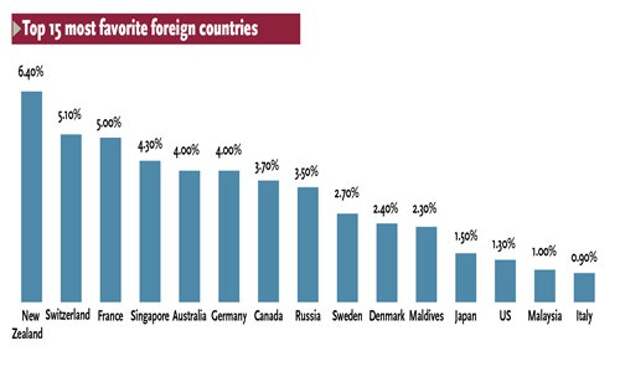 Япония, с которой Китай в этом году активно налаживал отношения и укреплял взаимное доверие, оказалась на четвертой строчке с 12,7%, далее отмечены страны Юго-Восточной Азии (6,9%), государства Латинской Америки (5,1%), африканские страны (4,2%), Индия (3,7%), Северная Корея (3,3%).