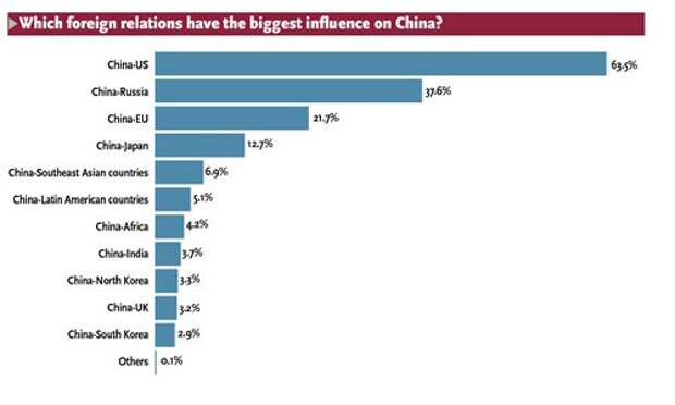 Отношения с Россией, которая, по словам руководства страны, остается одним из важнейших и наиболее надежных партнеров Китая в мире, жители КНР поставили на второе место. За влияние и важность роли России для развития Китая высказались 37,6% респондентов.