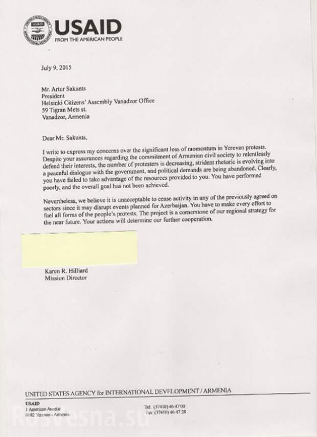 Весьма показательно письмо главы миссии USAID в Армении Карен Хиллиард председателю ванадзорского офиса Хельсинской гражданской ассамблеи Артуру Сакунтсу.