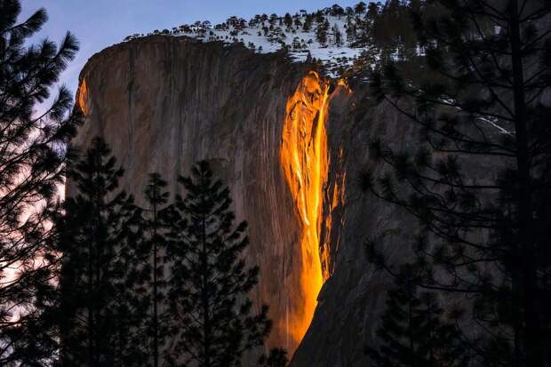 Каждый год, примерно во вторую неделю февраля, лучи заходящего солнца падают под определенным углом на водопад «Лошадиный хвост» в национальном парке Йосемити, освещая вершину водопада.