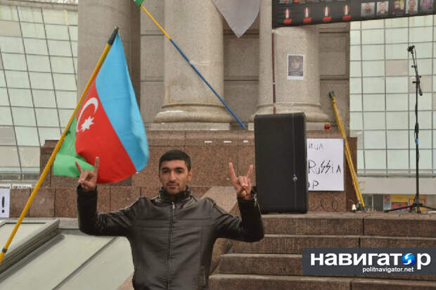 На стелу Независимости прикрепили плакаты «Путин убийца», «Стоп российский террор». Акция проходила под флагами непризнанной республики Ичкерия времен Дудаева – Масхадова и красно-черными знаменами украинских националистов. Также был один флаг Азербайджана.