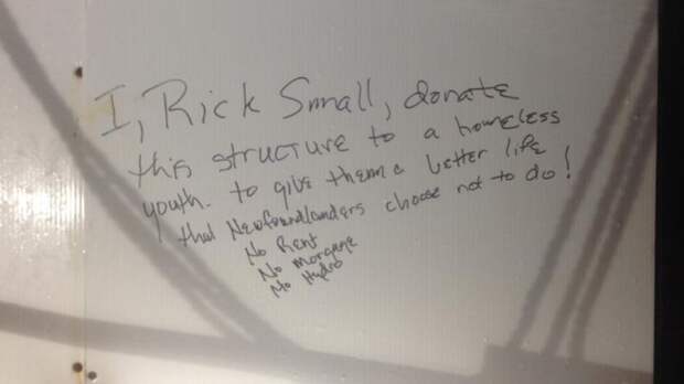 Внутри судна на стене написано: "Я, Рик Смолл, жертвую это сооружение бездомным молодым людям, чтобы у них была лучшая жизнь, которую ньюфаундлендцы предпочитают не иметь. Арендной платы нет, ипотеки нет, платы за электричество нет".